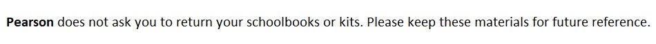*<u>BOOKS</u>: DO NOT RETURN-Pearson does not ask you to return your schoolbooks or kits. Please keep these materials for future reference.<br><br>